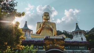Stroll through Kandy city’s vibrant streets, soaking up the lively markets and colonial architecture before embarking on a scenic journey to Dambulla. Along the way, pause at the Golden Temple of Dambulla — a spectacle of gilded splendor perched atop a rocky hill. Explore the ancient cave temples adorned with stunning Buddhist murals and hundreds of statues, their stories brought to life through vibrant colors and serene expressions.