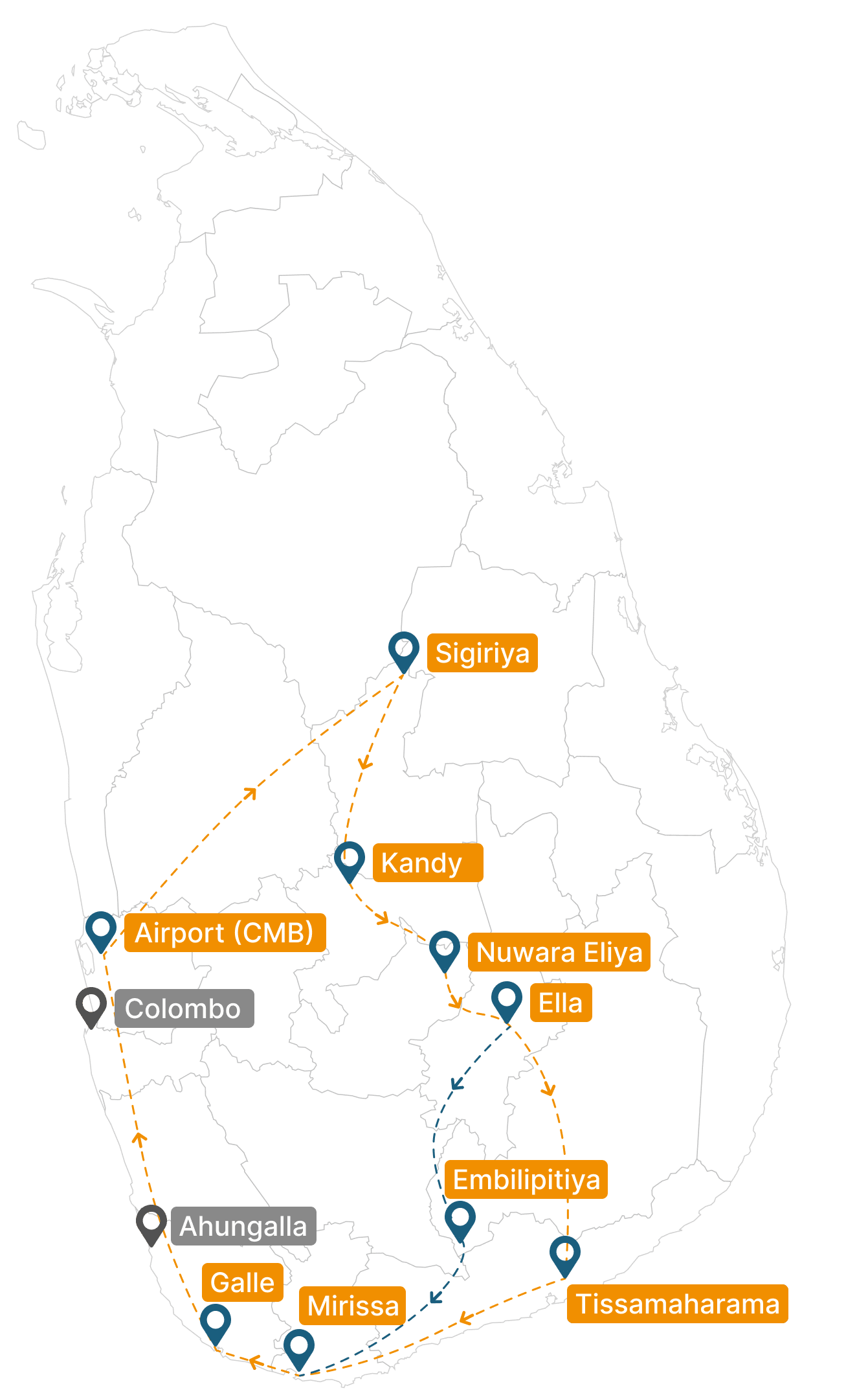 After a final morning to soak in the coastal atmosphere, commence your transfer back to Colombo or the airport. En route, visit a local artisan market where you can pick up last-minute souvenirs and gifts infused with Sri Lankan artistry—vibrant handloom textiles, intricate masks, or flavorful spices. As you approach the airport, your driver ensures a smooth and timely connection to your departure flight. Depart Sri Lanka enriched by memories of ancient fortresses, tranquil hills, wild encounters, and ocean whispers—an adventure that will linger in your heart forever.